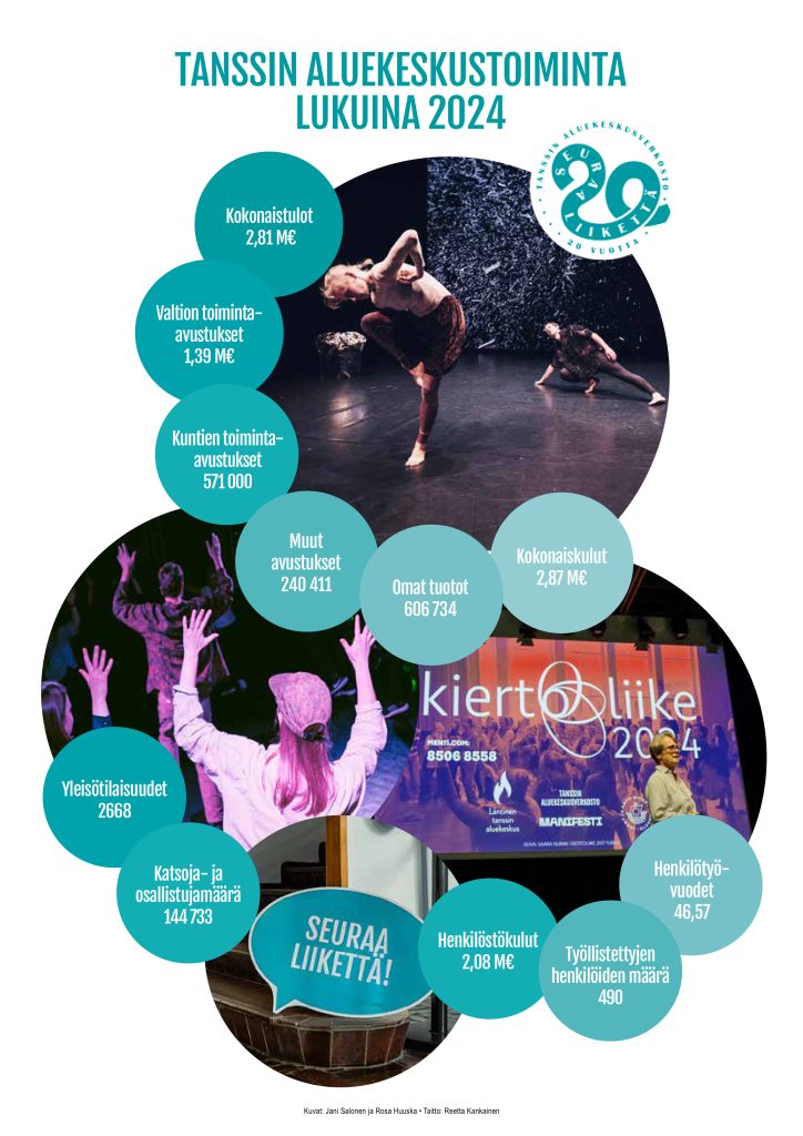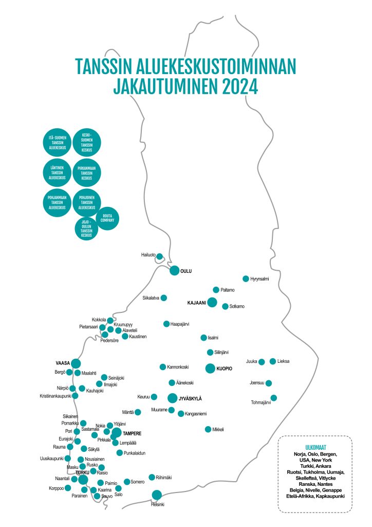 Tanssin aluekeskusverkosto on yhteistoiminta-alusta, jonka tavoitteena on kehittää tanssin alue- keskusten toimintaa. Verkosto on tanssin vapaan kentän suurin ja laaja-alaisin työllistäjä, joka turvaa maanlaajuisesti tanssitaiteen saatavuuden ja saavutettavuuden. Tanssin johtava ja moni- puolinen asiantuntijaverkosto toimii aktiivisena kulttuuripoliittisena vaikuttajana.